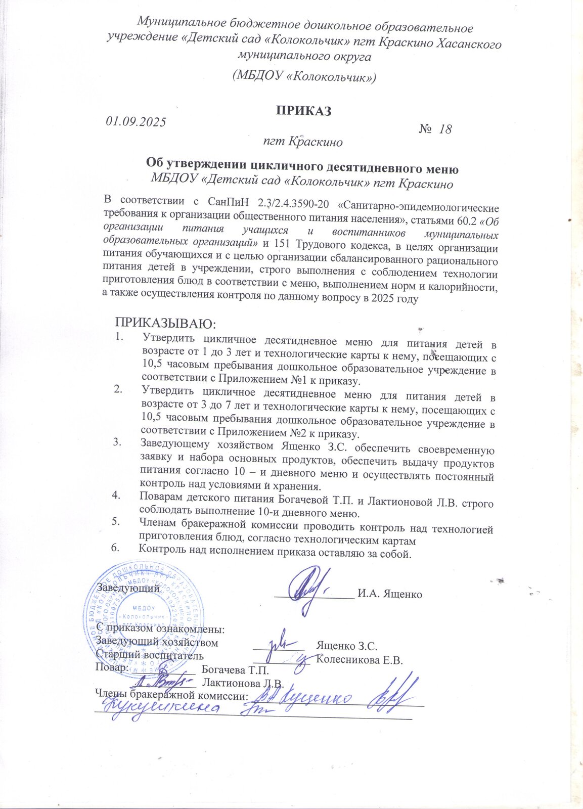 Питание воспитанников осуществляется учреждением МБДОУ "Колокольчик" пгт Краскино самостоятельно, без привлечения организаций, оказывающих услуги по организации питания в ОО, штатным персоналом, в соответствии с действующими : СанПиН 2.32.4.3590-20 Санитарно-эпидемиологические требования к организации общественного питания населения 2021 год.,СП 1.2.3685-21 «Гигиенические нормативы и требования к обеспечению безопасности и (или) безвредности для человека факторов среды обитания», ТР ТС, ГОСТ, утвержденными регламентами Таможенного союза, Роспотребнадзором.